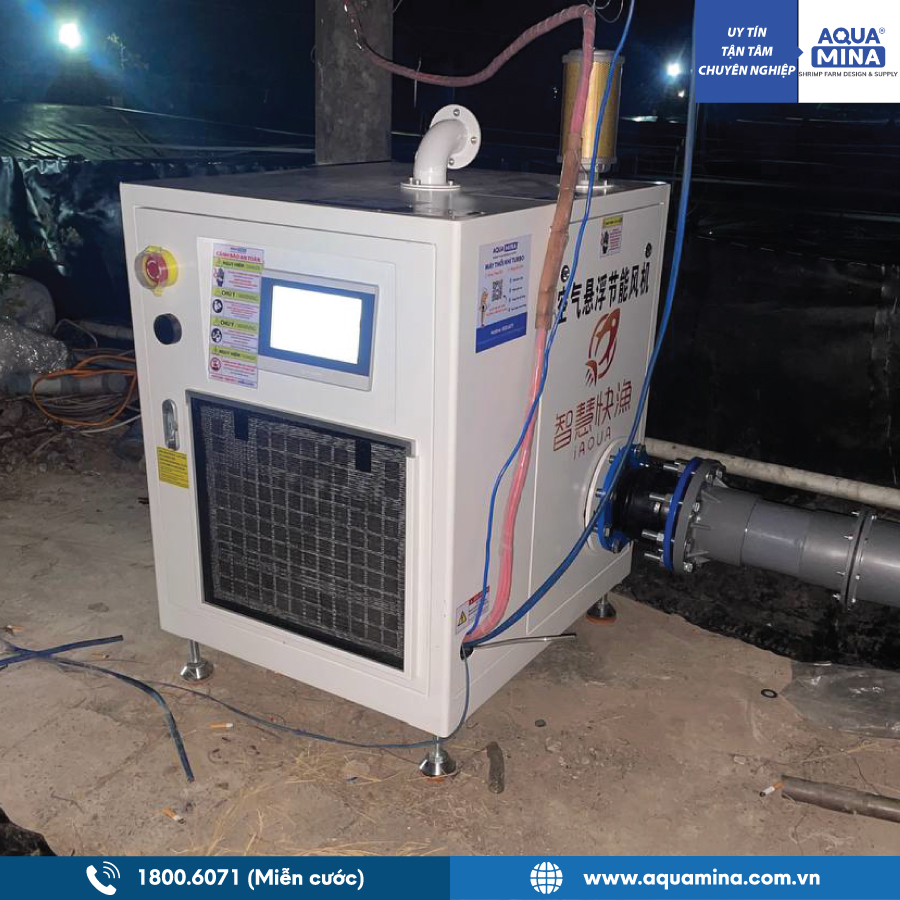 Máy thổi khí turbo Aqua Mina 7,5kW 25Kpa 3 pha là giải pháp thay thế vượt trội cho máy thổi khí truyền thống. Sản phẩm sử dụng công nghệ động cơ tuabin máy bay, số vòng quay lên tới 18000 vòng/phút giúp tăng hiệu suất tạo khí lên hơn 50%, tiết kiệm điện năng tới 50%, điều khiển tiếng Việt dễ sử dụng và cung cấp oxy ổn định giúp tôm phát triển khỏe mạnh. Với chính sách bảo hành 1 đổi 1 độc quyền tại Việt Nam, Aqua Mina mang đến sự an tâm tuyệt đối cho người nuôi.  Trong nuôi tôm công nghệ cao, việc cung cấp đủ oxy hòa tan cho ao tôm giúp tôm tăng trưởng tốt, hấp thụ thức ăn hiệu quả, tăng cường sức đề kháng và giảm thiểu bệnh tật.. Nhiều hộ nuôi tôm trước đây sử dụng máy thổi khí truyền thống (máy thổi khí suplan) nhưng loại máy này tiêu hao điện năng lớn, độ ồn cao và không điều chỉnh được công suất trong quá trình vận hành. Để giải quyết vấn đề, hãng iAqua đã phát triển dòng Máy thổi khí turbo 7,5kW 25Kpa 3 pha, hiện được Aqua Mina phân phối độc quyền tại thị trường Việt Nam. Đây chính là giải pháp thay thế hoàn hảo cho máy thổi khí truyền thống giúp tiết kiệm điện, vận hành ổn định và nâng cao hiệu quả nuôi trồng.