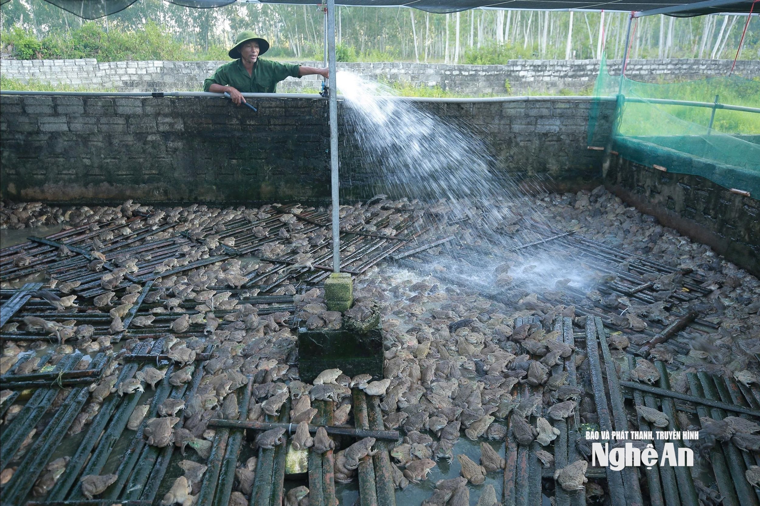 Tương tự, tại mô hình nuôi ếch Thái Lan quy mô 1.000 m² của ông Đào Văn Hóa ở phường Tân Mai, công tác chống nóng cũng được thực hiện chặt chẽ. Ngoài việc che lưới lan giảm nhiệt, ông lắp thêm hệ thống phun mưa trên mái để làm mát bể nuôi vào giữa trưa. Nước nuôi được thay hai lần mỗi ngày, kết hợp sử dụng chế phẩm sinh học để giữ môi trường sạch.