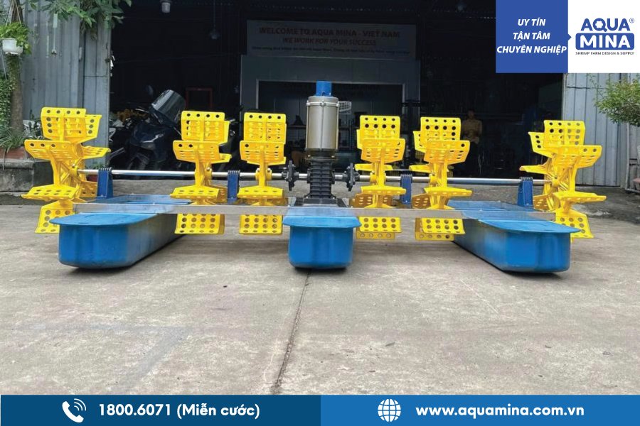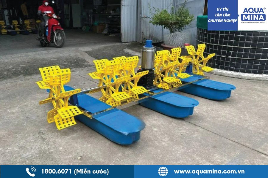 Bộ 4 cánh quạt nước đúc nguyên khối màu vàng; quạt 8 cánh tăng tần suất, nhiều oxy cho ao nuôi, không còn lo sợ thiếu hụt oxy.